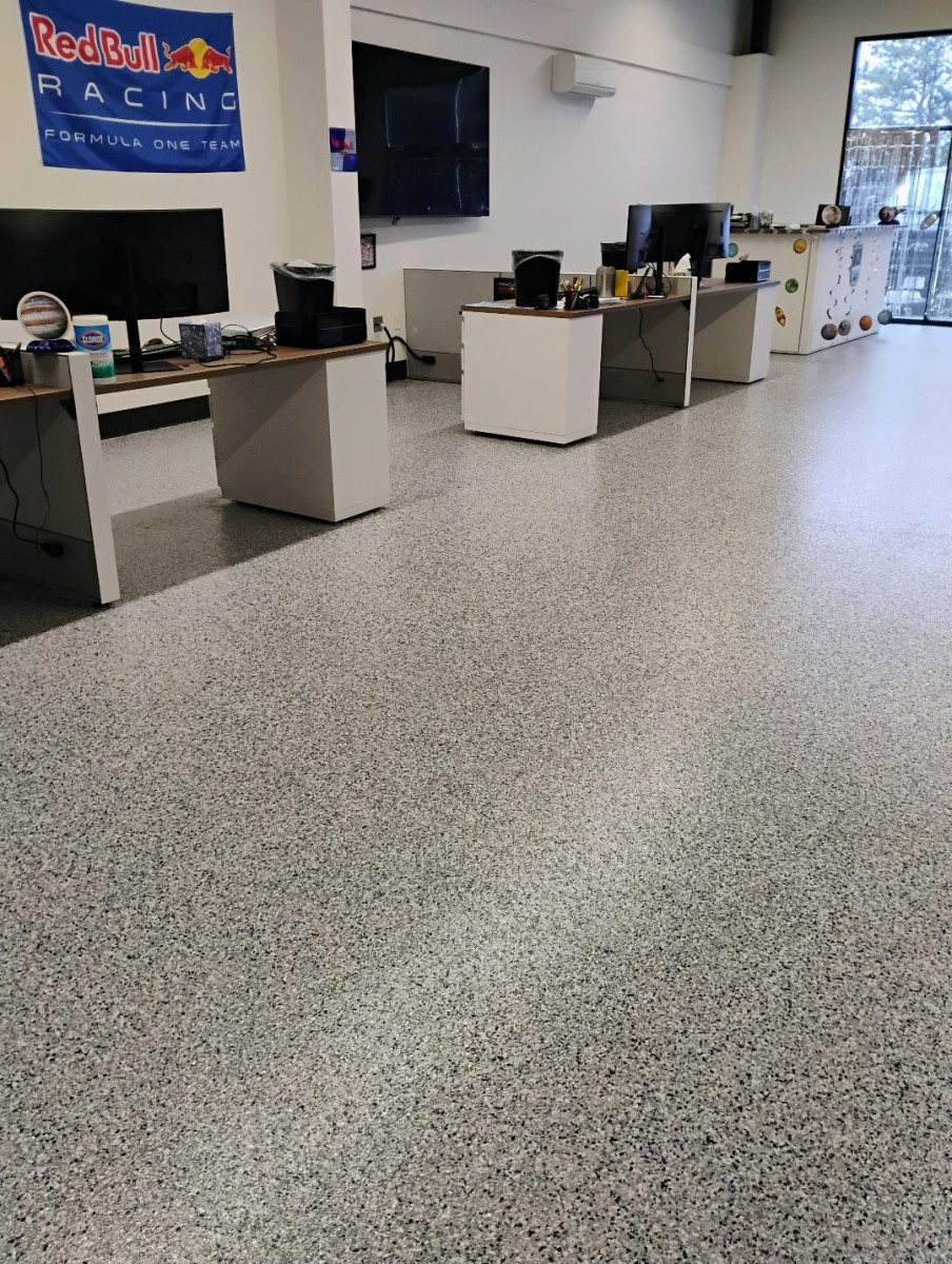 Color flake epoxy flooring is a stylish and durable solution that blends colored vinyl flakes into a seamless epoxy base. This system creates a textured surface that not only looks decorative but also adds slip resistance, making it ideal for residential garages, basements, and commercial spaces.